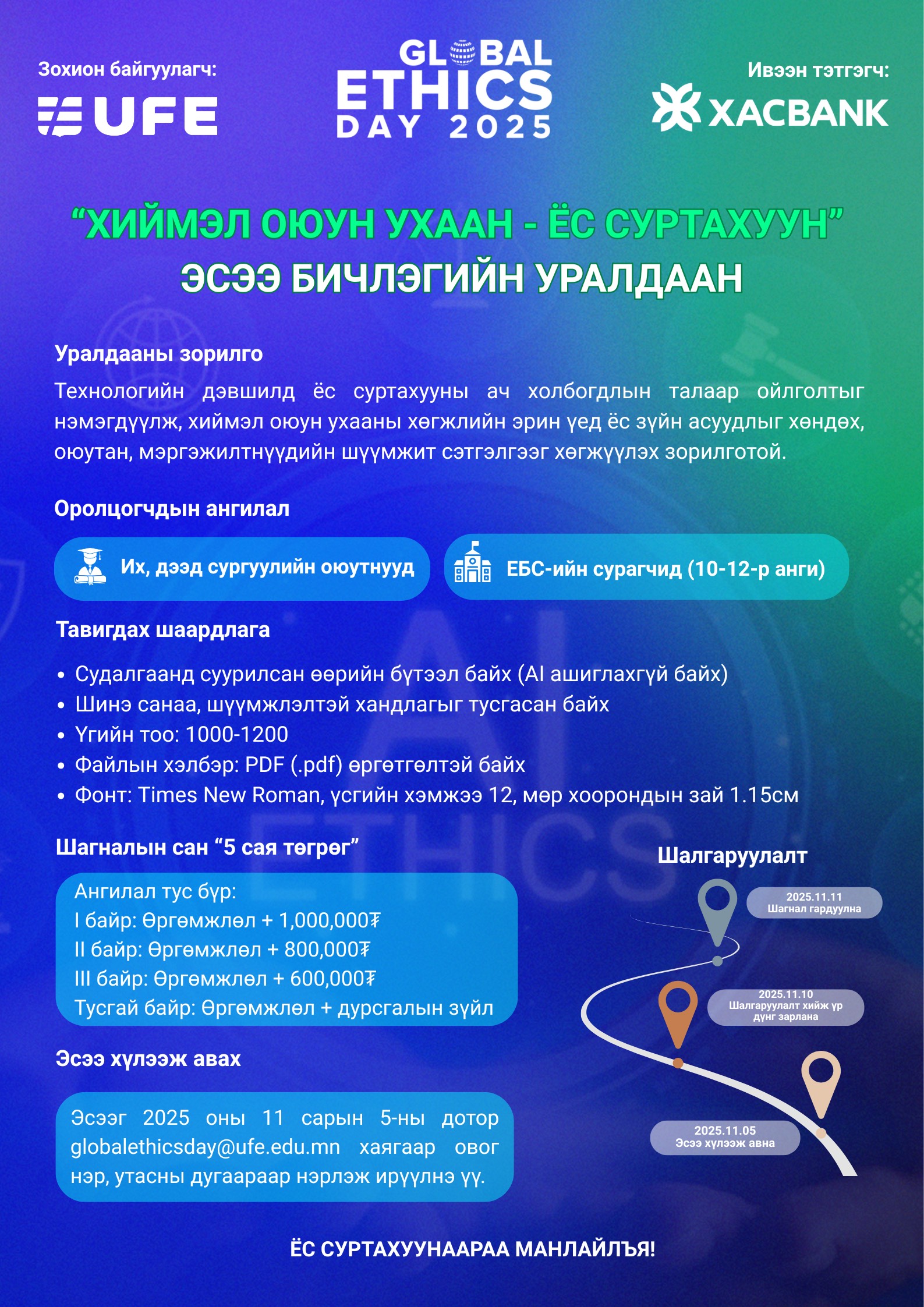Дэлхийн ёс зүйн өдрийг хамтдаа тэмдэглэн өнгөрүүлж, технологийн дэвшлийн эрин үед хиймэл оюун ухааныг ёс зүйтэй ашиглах, нийгэмдээ ёс суртахуунаараа манлайлах хүсэл эрмэлзэлтэй залуучууд та бүхнийг эсээ бичлэгийн уралдаанд идэвхтэй оролцохыг уриалж байна.